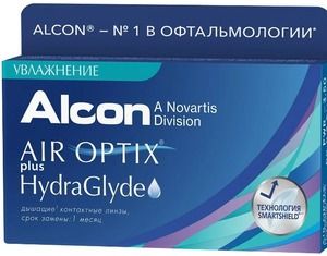 AIR OPTIX plus HydraGlyde — это сферические тонированные контактные линзы из материала Лотрафилкон Б с плазменной обработкой поверхности Дышащие контактные линзы Air Optix® plus HydraGlyde обеспечивают длительное увлажнение и защиту от загрязнений в течение всего срока ношения, поэтому легко забыть, что ты в линзах. МЕХАНИЗМ ДЕЙСТВИЯ (режим действий) Линзы из материала Лотрафилкон Б выступают в качестве преломляющей среды для фокусировки света лучей на сетчатке, когда они увлажнены и находятся на роговице. Как и все другие силикон-гидрогелевые линзы, линзы Air Optix plus HydraGlyde разрешены для дневного, гибкого и пролонгированного режима ношения. Линзы, как новые с 1-го по 30-ый день. Air Optix plus HydraGlyde безопасные линзы, так как пропускают кислород и не вызывают гипоксических повреждений роговицы. Возможность носить это оптическое изделие в разных режимах, будь то дневной, гибкий или пролонгированный — одно из главных его достоинств. В соответствии с предписаниями врача Вы сами выбираете, как использовать линзы. Если у Вас не будет возможности снять их, Вы можете лечь спать в них без вреда для глаз. Такие средства контактной коррекции можно не снимать до 6 ночей благодаря двум новым технологиям. При изготовлении AIR Optix plus HydraGlyde используются две уникальные технологии SmartShield и HydraGlyde. Благодаря им на поверхности линз возникает тончайший защитный слой. Его функция защищать контактные средства коррекции зрения от пересыхания и загрязнения. • Технология Smart Shield — это улучшенная плазменная обработка поверхности силикон — гидрогелевых линз, благодаря которой гидрофобные участки силикона на поверхности линзы «запечатываются», прячутся внутрь линзы. Контактная линза получившая такую обработку может хорошо смачивается и становится устойчивой к липидным отложениям и загрязнениям которые, как известно, являются одной из основных причин отказа от ношения «дышащих " линз. В отличии от лазерной обработки поверхности предыдущего поколения линз семейства Air Optix, технология SmartShield делает обработку более совершенной, поверхность линз Air Optix plus HydraGlyde по сравнению с поверхностью других линз семейства Air Optix намного более гладкая. Идеально гладкая поверхность — это безусловно больший комфорт при ношении линз. Низкий коэффициент трения верхнего века и поверхности линзы делает её менее ощутимой на глазах. В результате плазменной обработки поверхности SmartShield® внешние загрязнения не задерживаются на линзе и не проникают в неё. Микрочастицы пыли, крупинки пудры и других косметических средств больше не станут источником помех Вашего зрения. • Технология HydraGlyde — эта технология уже применяется в производстве такого популярного раствора для линз компании Alcon как Опти-фри Pure Moist. Суть технологии HydraGlyde заключаются в следующем — одна часть матрицы HydraGlyde встраивается в поверхность линзы, а другая её часть прочно удерживает на поверхности линзы влагу, не давая ей испаряться. Система HydraGlyde сохраняет необходимый уровень влажности Ваших глаз, даже если Вы вынуждены носить линзы дольше 12 часов. Именно от степени гидратации поверхности линзы зависит Ваше ощущение комфорта, а значит, и допустимая длительность использования контактных изделий. Длительное увлажение HYDRAGLYDE® — увлажняющая матрица, которая обеспечивает: -Комфорт при надевании -Увлажнение линзы в течение всего дня Резуль