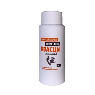 Квасцы — это кристаллогидратные двойные сернокислые соли алюминия. Наибольшее применение в различных отраслях промышленности и медицине нашли алюмокалиевые квасцы. Алюмокалиевые квасцы встречаются в природе как солевой минерал горно-вулканического происхождения (алунит).Квасцы обладают следующими свойствами: вяжущее, кровоостанавливающее, успокаивающее, очищающее, антибактериальное, антиперспирантными.Применяются в косметологии в составе антиперспирантов и средств по уходу за кожей.Квасцы снижают секрецию потовых и сальных желез, являясь довольно сильными антиперспирантами, а также оказывают дезодорирующий эффект.Многие соединения алюминия, которые обычно используются в дезодорантах-антиперспирантах (например, гидроксихлорид алюминия), проникают в кровь, очень медленно выводятся из организма и накапливаются во внутренних органах. Кроме этого, они способны образовывать пробки в протоках потовых желез, с последующим нарушением функционирования желез. Этот факт вызывает серьезные опасения медиков. В отличие от этих соединений, алюмокалиевые квасцы не проникают в клетки и не нарушают работу потовых желез.Действие квасцов основано не на блокировании потовых желез или закупорке пор, а на его высоких адсорбционных свойствах. Он обезвоживает и, следовательно, губит бактериальные клетки, чья жизнедеятельность и является источником запаха. Действительно справляясь со своей задачей, в отличие от современных дезодорантов, он, в отличие от них же, не вызывает аллергии и может без опаски использоваться астматиками и беременными женщинами.Присыпка, консистенция сухая, цвет белый, без запаха