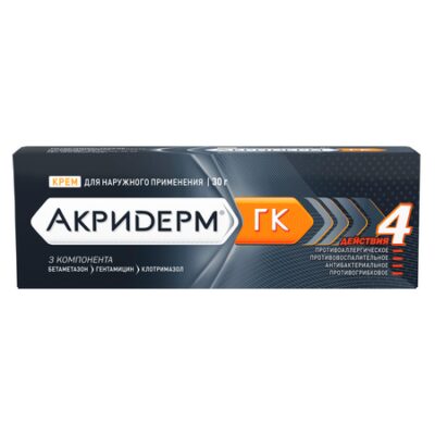 Показания При наружном применении препарата в терапевтических дозах трансдермальное всасывание действующих веществ в кровь очень незначительное. При аппликации на кожу интенсивность всасывания бетаметазона зависит от состояния эпидермального барьера (воспаление и кожные заболевания повышают всасывание). Применение окклюзионных повязок повышает трансдермальное всасывание бетаметазона и гентамицина, что может приводить к повышению риска развития системных побочных эффектов. Фармакологическое действие Комбинированный препарат для наружного применения с противовоспалительным, противоаллергическим, противогрибковым (фунгицидным) и антибактериальным действием. Гентамицин — антибиотик широкого спектра бактерицидного действия из группы аминогликозидов, высокоактивен в отношении грамотрицательных бактерий Proteus spp. (индол-положительные и индол-отрицательные штаммы), Escherichia coli, Klebsiella spp., Salmonella spp., Shigella spp., Campylobacter spp., Staphylococcus spp. (метициллинрезистентные). Активен в отношении Serratia spp., Pseudomonas spp., Acinetobacter spp., Citrobacter spp. К гентамицину резистентны: Neisseria meningitidis, Treponema pallidum, анаэробные микроорганизмы (Streptococcus spp. (кроме Streptococcus pneumoniae), Providencia rettgeri). Бетаметазон — ГКС, оказывает противовоспалительное, противоаллергическое, антиэкссудативное действие. Клотримазол — противогрибковое средство из группы производных имидазола. Оказывает действие за счет нарушения синтеза эргостерина, являющегося составной частью клеточной мембраны грибов. Обладает широким спектром действия. Активен в отношении патогенных дерматофитов (Trichophyton rubrum, Trichophyton mentagrophytes, Epidermophyton floccosum, Microsporum canis), дрожжевых и плесневых грибов (Candida albicans, Turolopsis glabrata, Rhodotorula spp., Pityrosporum orbiculare). Лекарственное взаимодействие Взаимодействие препарата Акридерм® ГК с другими лекарственными средствами не установлено.