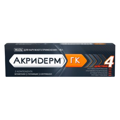 Показания При наружном применении препарата в терапевтических дозах трансдермальное всасывание действующих веществ в кровь очень незначительное. При аппликации на кожу интенсивность всасывания бетаметазона зависит от состояния эпидермального барьера (воспаление и кожные заболевания повышают всасывание). Применение окклюзионных повязок повышает трансдермальное всасывание бетаметазона и гентамицина, что может приводить к повышению риска развития системных побочных эффектов. Фармакологическое действие Комбинированный препарат для наружного применения с противовоспалительным, противоаллергическим, противогрибковым (фунгицидным) и антибактериальным действием. Гентамицин — антибиотик широкого спектра бактерицидного действия из группы аминогликозидов, высокоактивен в отношении грамотрицательных бактерий Proteus spp. (индол-положительные и индол-отрицательные штаммы), Escherichia coli, Klebsiella spp., Salmonella spp., Shigella spp., Campylobacter spp., Staphylococcus spp. (метициллинрезистентные). Активен в отношении Serratia spp., Pseudomonas spp., Acinetobacter spp., Citrobacter spp. К гентамицину резистентны: Neisseria meningitidis, Treponema pallidum, анаэробные микроорганизмы (Streptococcus spp. (кроме Streptococcus pneumoniae), Providencia rettgeri). Бетаметазон — ГКС, оказывает противовоспалительное, противоаллергическое, антиэкссудативное действие. Клотримазол — противогрибковое средство из группы производных имидазола. Оказывает действие за счет нарушения синтеза эргостерина, являющегося составной частью клеточной мембраны грибов. Обладает широким спектром действия. Активен в отношении патогенных дерматофитов (Trichophyton rubrum, Trichophyton mentagrophytes, Epidermophyton floccosum, Microsporum canis), дрожжевых и плесневых грибов (Candida albicans, Turolopsis glabrata, Rhodotorula spp., Pityrosporum orbiculare). Лекарственное взаимодействие Взаимодействие препарата Акридерм® ГК с другими лекарственными средствами не установлено.