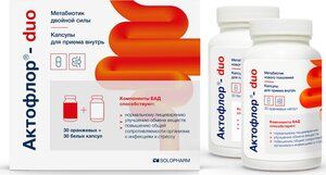 Actoflor-Duo — Биологически активная добавка (БАД) к пище — метабиотик двойной силы, нового поколения представляющий собой комплекс аминокислот и органических кислот — аналогов метаболитов пробиотических бактерий.Синергическое действие компонентов, входящих в состав комплекса, повышает физиологическую активность и стимулирует рост собственной полезной микрофлоры человека, увеличивает её антагонистическую активность против патогенных микроорганизмов.Содержание биологически активных веществ (суммарно 2 капсулы):Витамин Вз (рибофлавин) — 6 мг — 375 % не превышает верхний допустимый уровень потребления.Витамин В9 (в пересчете на фолиевую кислоту) — 600 мкг — 300 % не превышает верхний допустимый уровень потребления.Янтарная кислота — 64,8 мг — 32,4% не превышает верхний допустимый уровень потребления.Компоненты БАД способствуют:нормальному пищеварениюулучшению обмена веществповышению общей сопротивляемости организма к инфекциям и стрессуПоказания к применениюСпособствует восстановлению микрофлоры кишечника,способствует предотвращению побочных эффектов приема антибиотиков,способствует улучшению обмена веществ.