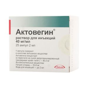 Показания к применениюМетаболические и сосудистые нарушения головного мозга (в том числе ишемический инсульт, черепно- мозговая травма).Периферические (артериальные и венозные) сосудистые нарушения и их последствия (артериальная ангиопатия, трофические язвы).Заживление ран (язвы различной этиологии, ожоги, трофические нарушения (пролежни), нарушение процессов заживления ран). Профилактика и лечение лучевых поражений кожи и слизистых оболочек при лучевой терапии.Применение при беременности и кормлении грудьюИспользование препарата у беременных не вызывало негативного воздействия на мать или плод. Однако при применении у беременных женщин необходимо учитывать потенциальный риск для плода.ПротивопоказанияГиперчувствительность к препарату Актовегин или аналогичным препаратам, декомпенсированная сердечная недостаточность, отек легких, олигурия, анурия, задержка жидкости в организме. С осторожностью: гиперхлоремия, гипернатриемия.Побочное действиеАллергические реакции кожная сыпь. гиперемия кожи. гипертермия, вплоть до анафилактического шока.СоставАктивное вещество: актовегина концентрат 80 мг, Вспомогательные вещества: натрия хлорид, вода д/и.Взаимодействие с другими препаратамиВ настоящее время неизвестно.