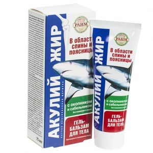 Акулий жир (окопник/сабельник) — гель бальзам — консистенция умеренно густая, цвет прозрачно-белый, запах нейтральныйСредство содержит минимальную дозу консервантов и совсем не имеет искусственных ароматизаторов, парфюмерных отдушек и прочих примесей. Это означает, что оно на 90 % состоит из натуральных компонентов.Акулий жир — способен нормализовать обменные процессы не только внутри суставов конечностей, но и внутри межпозвоночных дисков. Он также укрепляет мышцы и связки, и способен избавить от солевых отложений. Ускоряет процессы регенерации при повреждениях хрящей и костей, предотвращает разрушение хрящей, ускоряет заживление переломов, снимает болевой синдром, повышает эластичность соединительной ткани.Окопник- уникальное по воздействию на кости и суставы. При проблемах с суставами и травмах, в качестве заживляющего, противовоспалительного, анти ревматического средства окопнику нет равных. Особенно прославился окопник своей способностью быстро заживлять раны и травмы, благодаря чему являлся первым средством помощи раненым в полевых условиях. Поразительный эффект окопника связан с высоким содержанием аллантоина, который не только характеризуется мощным бактерицидным и противовоспалительным действием, но и обладает уникальной способностью стимулировать образование новых, здоровых клеток любой ткани.При проблемах с суставами окопник снимает воспаление и отеки, а главное, активизирует процессы обновления и регенерации хряща.Сабельник болотный — лекарственное растение с выраженным биостимулирующим, антибактериальным, обезболивающим, противовоспалительным, солевыводящим, противоревматическим и регенерирующим действием. Содержит микроэлементы (фосфор, калий, магний, медь), дубильные вещества, флавон иды, эфирные масла, органические кислоты, каротин. Признанное народное средство для борьбы с ревматизмом, радикулитом, артритами и артрозами, отложением солей в суставах рук и ног. Способствует снятию отечности, повышает подвижность суставов и позвоночника. Комплекс экстрактов лекарственных растений, составленный по принципу синергизма, обладает противовоспалительным действием, способствует выведению солей, снятию отека и мышечного спазма, активизирует кровообращение и улучшает трофику тканей..Результат: устраняет (уменьшает) воспаление и отечность, снимает мышечный спазм, восстанавливает нормальное кровоснабжение сустава, улучшает питание сустава (особенно, хрящевой ткани), замедляет процессы разрушения хряща, стимулирует его регенерацию, активизирует выведение продуктов распада (шлаков, солей)