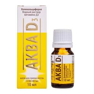 АКВА Д3 — Биологически активная добавка (БАД) к пище — водный раствор АКВА Д3 капли для приема внутрьВнешний вид и свойства: бесцветная, прозрачная или слегка опалесцирующая жидкость с анисовым запахомПрием в рекомендованной дозировке (1 капля в день) обеспечивает поступление витамина ДЗ -12,5 мкг (500МЕ) — 250% от средней суточной потребности*/***- Приложение 2 к техническому регламенту Таможенного союза «Пищевая продукция в части ее маркировки» (ТРТС 022/2011)**- не превышает верхний допустимый уровень потребления в сутки — Приложение 5 «Единых санитарно-эпидемиологических и гигиенических требований к товарам подлежащим санитарно-эпидемиологическому надзору (контролю)».В 1 мл содержание вит Д3 -15 000 МЕВсем известно, что витамин D3 вырабатывается под воздействием солнечного света, поэтому жители северных стран, как правило, испытывают его дефицит.Приём витамина D3 не только снижает риск появления различных заболеваний, но и улучшает общее состояние организма, замедляя процесс старения.Приём витамина D3 в совокупности с другими витаминами усиливает иммунную систему и является хорошим профилактическим средством против простудных заболеваний.
