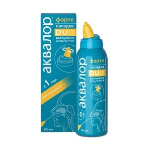 Аквалор Форте Дуо — гипертонический раствор морской воды, предназначенный для деликатного орошения и промывания носовых ходов у взрослых и детей с 1 года. Металлический флакон объемом 150 мл снабжен инновационной поворотной насадкой с двойным типом распыления «душ/струя». Режим «душ» используется для снятия заложенности за счёт максимальной площади взаимодействия с отечной слизистой, а режим «струя» — при сильном насморке. В его основе – натуральная морская вода, которая забирается из экологически чистых районов Атлантического океана в территориальных водах Франции и Швеции. Она богата множеством полезных микроэлементов, за счет чего средство обладает антисептическим, иммуностимулирующим действием. Благодаря высокой концентрации соли Аквалор Форте Дуо способствует снятию отека слизистой, облегчая носовое дыхание в период респираторного заболевания, очищает и увлажняет носоглотку после оперативного вмешательства. Может применяться для профилактики и комплексного лечение респираторных инфекций (ОРВИ и др.). Не является лекарственным средством.