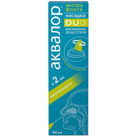 Аквалор® содержит микроэлементы природной морской воды: ионы натрия, калия, цинка, селена, магния, кальция, йода, хлора, брома. Аквалор® Экстра Форте: — удаляет слизь, уменьшает выделения, размягчает и удаляет корки; — увлажняет слизистую оболочку полости носа; — оказывает благоприятное воздействие на слизистую оболочку полости носа и носоглотки; — обеспечивает уменьшение отека слизистой оболочки полости носа благодаря гипертонической концентрации морской воды; — содержит экстракты алоэ вера и ромашки римской, которые обладают противовоспалительными, антисептическими и восстанавливающими свойствами; — способствует разжижению слизи и нормализации ее выработки в бокаловидных клетках слизистой оболочки; — улучшает работу клеток мерцательного эпителия слизистой оболочки носа, нормализуют реологические свойства слизи, усиливают резистентность к внедрению вирусов и бактерий; — обладает антисептическими свойствами; — создает условия для активации местного иммунитета слизистой оболочки носа и околоносовых пазух; — повышает терапевтическую эффективность лекарственных средств, наносимых на слизистую оболочку полости носа; — сокращает продолжительность респираторных заболеваний; — снижает риск распространения инфекции в околоносовые пазухи и полость уха; — способствует удалению любых патогенов (вирусных, бактериальных, грибковых) со слизистой оболочки полости носа и носоглотки, не нарушая биоценоза слизистой оболочки.Внутрь баллона помещен четырехслойный пакет с содержимым, снабженный специальным односторонним клапаном. Насадка имеет перемычку для контроля нажатия на аэрозольный клапан. Не является лекарственным средством.