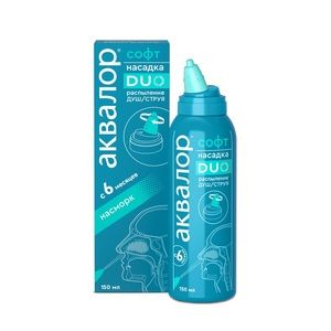 Средство для орошения и промывания полости носа для детей и взрослых «аквалор софт дуо» 150 мл, представляет собой аэрозоль в металлическом баллоне с анатомической насадкой для носа и пластиковым колпачком. содержимое баллона — прозрачная бесцветная жидкость без запаха, со слабосоленым вкусом, являющаяся стерильным раствором морской воды, с изотонической концентрацией nacl.не содержит консервантов. не является лекарственным средством.отличительные особенности вариантов исполнения «аквалор» приведены в таблице:наименование изделия возраст применения характер распыления аквалор софт, аквалор софт мини с 6 месяцев душ