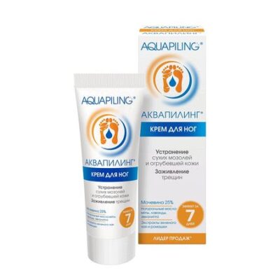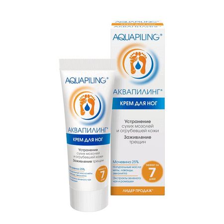 Крем для ног серии АКВАПИЛИНГ® специально разработан для восстановления здорового состояния кожи на подошвах: • эффективно борется с огрубевшей сухой кожей • способствует заживлению трещин • препятствует образованию новых участков сухой огрубевшей кожи • не содержит отдушек и красителей • эффект за 7 дней Крем для ног АКВАПИЛИНГ® эффективен благодаря высокой концентрации натуральных компонентов, разрыхляющих и устраняющих омертвевшие слои кожи. Мочевина 25% и глицерин глубоко увлажняют кожу. В результате огрубевшая, шершавая кожа уже через 7 дней становится гладкой, эластичной и увлажненной. Натуральные масла лаванды, мяты и эвкалипта, а также экстракты ромашки и зеленого чая обладают противовоспалительным, антибактериальным и заживляющим действиями. Крем обладает насыщенной, но нежирной текстурой. Подходит для ежедневного использования.