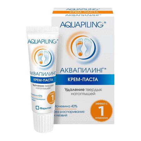 Крем-паста для устранения натоптышей серии АКВАПИЛИНГ® (AQUAPILING®) специально разработана для устранения плотных участков твердой ороговевшей кожи, возникающих при ношении тесной обуви, при длительной ходьбе, работе «на ногах», при деформации стопы или при состояниях, сопровождающихся избыточным ороговением. Мочевина в высокой концентрации 40% позволяет размягчать и удалять даже самые твердые натоптыши, в том числе каменистой плотности, быстро и безболезненно. Благодаря форме «крем-паста» АКВАПИЛИНГ® легко использовать даже при сложной локализации (например, между пальцами). Безопасен в применении. Не сушит кожу. Без распаривания и лезвий. Меры предосторожности: возможна индивидуальная непереносимость отдельных компонентов. Условия хранения: хранить при температуре от +5°С до +25°С.