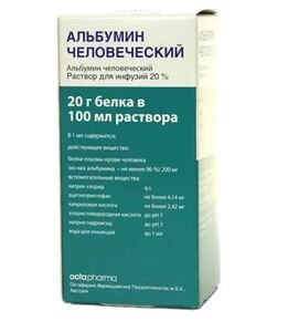 Показания к применениюСнижение концентрации альбумина в плазме менее 30 г/л или коллоидно-онкотического давления менее 15 мм рт.ст., или снижение общего белка менее 50 г/л: гипоальбуминемия различного генеза — шок (геморрагический, травматический, термический), острая кровопотеря (снижение ОЦК более чем на 25-30%), гнойно-септические состояния, заболевания печени с нарушением альбуминсинтезирующей функции, заболевания почек (нефрит, нефротический синдром), ожоговая болезнь;операции с использованием искусственного кровообращения;лечебный плазмаферез;гемолитическая болезнь новорожденных во время обменного переливания крови;проведение предоперационной гемодилюции и заготовка компонентов аутокрови;отек мозга (гиперонкотические растворы);заболевания ЖКТ с нарушением всасывания или проходимости.Состав1 мл раствора содержит альбумин человеческий 200 мг.