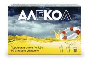 «Алекол» содержит компоненты, которые способствуют ускорению метаболизма алкоголя, уменьшению его токсического влияния и снижению выраженности похмельного синдрома.Янтарная кислота – это естественный метаболит, образующийся при взаимопревращении углеводов, белков и жиров. Янтарная кислота увеличивает потребление кислорода тканями, а также является важным участником обмена веществ, в частности, цикла Кребса – основного пути катаболизма многих веществ и синтеза энергии в организме. При возрастании нагрузки на организм (а этанол в больших количествах оказывает сильное неблагоприятное воздействие на многие системы организма), поддержание его работы обеспечивается преимущественно за счет окисления янтарной кислоты, что ведет к истощению ее запасов в организме и, как следствие, дефициту энергии, чувству усталости, недомоганию. Содержащиеся в «Алеколе» 200 мг янтарной кислоты составляют рекомендуемую дневную дозу и помогают восполнить запасы этого вещества во время приема алкоголя, когда оно интенсивно расходуется, а также подстегнуть метаболические процессы, ускорив выведение из организма недоокисленных продуктов распада алкоголя, и улучшить дыхательную функцию клеток.Результаты исследований, представленные в ряде научных публикаций, указывают на то, что янтарная кислота наиболее эффективно проявляет свои свойства при применении в сочетании с лимонной кислотой.Лимонная кислота также содержится в живых клетках. Она участвует в процессах синтеза энергии, играет важную роль в системе биохимических реакций клеточного дыхания множества организмов. Ее действие на организм сходно с действием янтарной кислоты. К тому же лимонная кислота может служить дополнительным стимулятором эндогенного синтеза янтарной кислоты, так как является её отдаленным предшественником.Порошок для растворения