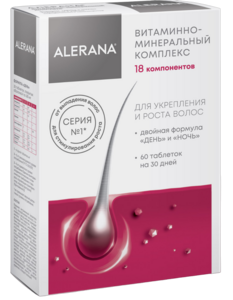 Витаминно-минеральный комплекс ALERANA для интенсивного питания волосяных фолликулов и восполнения недостатка витаминов. Двойная формула «день+ночь» разработана с учетом совместимости компонентов и основана на результатах исследований о суточном ритме роста волос. Комплекс содержит 18 активных макро- и микроэлементов, которые: обеспечивают волосяные фолликулы веществами, необходимыми для здорового роста и развития уменьшают выпадение волос улучшают состояние волос и кожи головы способствуют появлению здорового блеска оказывают общеукрепляющее антиоксидантное действие на организмКомпоненты формулы «День» способствуют улучшению состояния волос и кожи головы, появлению здорового блеска волос, повышению их густоты, оказывают общеукрепляющее, антиоксидантное действие.Компоненты формулы «Ночь» обеспечивают волосяные фолликулы веществами, необходимыми для роста и развития, замедляют выпадение волос, способствуют восстановлению волосяных фолликулов.Клинически доказано: курсовое применение витаминного комплекса на 82% уменьшает выпадение волос, на 83% снижает скорость засаливания волос и на 57% увеличивает блеск.