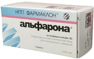 Препарат представляет собой лиофилизированный порошок или пористую массу белого или светло-желтого цвета, гигроскопичен, после растворения в 5 мл воды для инъекций образуется прозрачный бесцветный или светло-желтого цвета раствор, без осадка и посторонних включений.Характеристика препарата:АЛЬФАРОНА — человеческий рекомбинантный интерферон-альфа-2b — белок, синтезированный штаммом Escherichia coli. в генетический аппарат которой встроен ген человеческого лейкоцитарного интерферона альфа-2b. Альфарона идентичен человеческому лейкоцитарному интерферону альфа-2b.Обладает противовирусным, иммуномодулирующим, противовоспалительным, противомикробным действием.