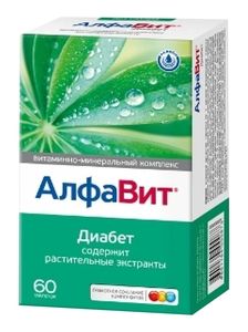 Витамины для больных диабетом и склонных к нему.Состав комплекса разработан таким образом, что каждая таблетка Алфавит Диабет содержит только совместимые компоненты и обладает специфическим («целевым») действием:Таблетка «Энергия+» (белого цвета) содержит витамин В1 и фолиевую кислоту, участвующие в энергетическом обмене, а также витамин С и железо для профилактики анемии, экстракт черники, которая способствует снижению уровня сахара в крови, липоевую кислоту, повышающую усвоение глюкозы, и янтарную кислоту, которая восстанавливает чувствительность клеток к инсулину, усиливает его синтез и секрецию,Таблетка «Антиоксиданты+» (голубого цвета) содержит витамины А, С и Е, селен и другие вещества, укрепляющие иммунитет, помогающие противостоять вредным воздействиям среды, способствующие профилактике осложнений диабета. Также в эту таблетку включены йод, необходимый для нормализации работы гормональной системы и цинк — для синтеза инсулина.Таблетка «Хром+» (розового цвета) помимо хрома, необходимого для образования активной формы инсулина, содержит витамин D3, кальций и другие полезные вещества, которые укрепляют кости, зубы и уменьшают риск развития остеопороза, а витамин K1 способствует увеличению свертываемости крови, повышению устойчивости стенок сосудов.Витаминно-минерфальный комплекс Алфавит Диабет разработан с учетом особенностей обмена веществ у людей, страдающих диабетом.Содержит все необходимые витамины и минералы, а также липоевую и янтарную кислоты, экстракты побегов черники, корней лопуха и одуванчика. Эти вещества способствуют профилактике осложнений диабета и положительно влияют на переносимость глюкозыБез сахара.Биологически активные компоненты:Содержание в 1 таблетке № 1 (белого цвета): витамин С — 50±7,5 мг, В1 — 4,0±0,6 мг, А — 0,500±0,075 мг, фолиевая кислота — 0,25±0,0375, железо -15±2,25 мг, медь — 1,0±0,15 мг, янтарная кислота — 50,0±7,5 мг, липоевая кислота — 15,0±2,25 мг.Содержание в 1 таблетке № 2 (голубого цвета): витамин С — 50±7,5 мг, Е — 30,0±4,5 мг, никотинамид — 30,0±4,5 мг, В2 — 3,0±0,45 мг, В6 — 3,0±0,45 мг, А — 0,5±0,075 мг, магний — 40,0±6,0 мг, цинк — 18,0±2,7 мг, йод — 150,0±22,5 мкг, селен — 70,0±10,5 мкг, марганец — 3,0±0,45 мг.Содержание в 1 таблетке № 3 (розового цвета): пантотеновая кислота — 7,0±1,05 мг, фолиевая кислота — 0,25±0,0375, витамин В12 — 4,0±0,6 мкг, биотин — 70,0±0,6 мкг, витамин К1 — 120,0±18,0 мкг, витамин Д3 — 5,0±0,75 мкг, кальций — 150±22,5 мг, хром — 150±22,5 мкг.