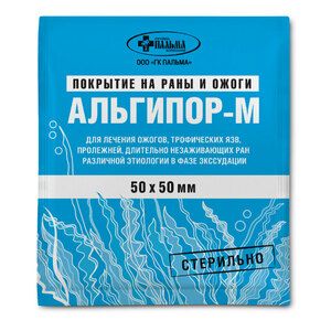 Альгипор-М — современная рассасывающаяся ранозаживляющая повязка, изготовленная на основе альгината натрия — природного полисахарида, выделяемого из бурых морских водорослей. В качестве антисептика содержит фурацилин, активный в отношении грамположительной микрофлоры. Альгипор-М предназначен для лечения ожогов 2-3 а степени, вялотекущих ран, трофических язв, пролежней, длительно незаживающих ран, в том числе у онкологических больных, а также при лечении глубокого кариеса и пульпита в стоматологии. Повязки Альгипор-М стимулируют процессы регенерации, обладают хорошими дренирующими свойствами (поглощают раневое отделяемое), ускоряют очищение ран. Альгипор-М выпускается в виде герметично упакованных стерильных листов пористого материала размером 50 х 50 и 60 х 100 мм. Клинические испытания АЛЬГИПОРА-М, проведенные в крупнейших хирургических клиниках и ожоговых центрах, показали его следующие преимущества: стимулирует процессы регенерации, способствует эпителизации, обладает хорошими дренирующими свойствами,
