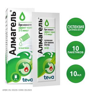 Показания к применениюЛечение Изжога и боли в эпигастрии после погрешностей в питании избыточного употребления этанола никотина кофе приема лекарственных средств раздражающих слизистую оболочку желудка. Острый гастрит хронический гастрит с повышенной и нормальной секреторной функцией желудка (в фазе обострения) острый дуоденит энтерит колит. Язвенная болезнь желудка и двенадцатиперстной кишки (в фазе обострения). Грыжа пищеводного отверстия диафрагмы гастроэзофагеальный рефлюкс рефлюксэзофагит дуоденогастральный рефлюкс. Симптоматические язвы желудочнокишечного тракта различного генеза эрозии слизистой оболочки верхних отделов ЖКТ. Острый панкреатит обострение хронического панкреатита.Профилактика желудочных и дуоденальных нарушений уменьшение раздражающего и ульцерогенного действия связанного с приемом лекарственных препаратов раздражающих слизистую оболочку желудка.Применение при беременности и кормлении грудьюИсследования на животных не показали наличия тератогенного потенциала или других нежелательных эффектов на эмбрион и/или плод.Нет клинических данных о применении препарата Алмагель® беременными женщинами. Препарат Алмагель® не рекомендуется принимать во время беременности но если польза от его применения превышает потенциальный риск для плода то продолжительность применения не должна превышать 5 — 6 дней под наблюдением врача. Нет данных о выделении действующих веществ препарата Алмагель® с грудным молоком. Препарат Алмагель® можно применять в период кормления грудью только после тщательной оценки соотношения пользы для матери и потенциального риска для новорожденного.В период кормления грудью продолжительность применения не должна превышать 5 — 6 дней под наблюдением врача.ПротивопоказанияГиперчувствительность к действующему или к какомулибо вспомогательному веществу входящему в состав препарата. Тяжелая форма почечной недостаточности (клиренс креатинина < 30 мл/мин) изза риска развития гипермагниемии и алюминиевой интоксикации. Беременность. Болезнь Альцгеймера. Детский возраст до 10 лет. Редкая наследственная непереносимость фруктозы (содержит сорбитол). Выраженная гипофосфатемия.Состав10 мл (1 пакетик) суспензии содержат:действующие вещества: алюминия гидроксид гель 4 36 г (в пересчете на алюминия оксид 436 мг) магния гидроксид паста 700 мг (в пересчете на магния оксид 150 мг)вспомогательные вещества: водорода пероксида раствор 30 % - 0 82 мг сорбитол - 1602 30 мг гиэтеллоза - 21 80 мг метилпарагидроксибензоат - 21 80 мг пропилпарагидроксибензоат - 2 726 мг бутилпарагидроксибензоат - 2 726 мг натрия сахарината дигидрат - 1 636 мг пропиленгликоль - 654 00 мг мaкрогол 4000 - 436 00 мг лимона масло - 3 27 мг этанол 96 % - 196 20 мг вода очищенная до 10 мл. БалканФарма