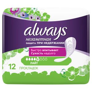 Always Light «Незаметная защита» прокладки урологические — для тех моментов, когда вам необходима дополнительная защита.Впитываемость: 5 капель (из 8).Они впитывают в 3 раза больше жидкости, чем обычные ежедневные прокладки*, и надолго сохраняют сухость.Кроме того, они оснащены технологией нейтрализации запаха, которая дарит непревзойденную свежесть и обеспечивает чувство уверенности.Попробуйте прокладки Always «Незаметная защита» для защиты при недержании.*по сравнению с самыми популярными ежедневными прокладками в России.Особенности: Быстро впитывает. Сухость надолго — ультравпитывающий внутренний слой превращает жидкость в гель и удерживает его внутри Эксклюзивная технология нейтрализации запаха Удерживается на месте, обеспечивая комфорт Защитные барьеры LeakGuards Проверено дерматологами С легким ароматом Прокладки Always «Незаметная защита при недержании» Лайт подходят при слабых и редких выделениях