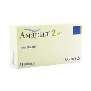 Показания к применению- сахарный диабет 2 типа (в качестве монотерапии или в составе комбинированной терапии с метформином или инсулином).Применение при беременности и кормлении грудьюАмарил противопоказан к применению при беременности. В случае планируемой беременности или при наступлении беременности женщину следует перевести на инсулинотерапию.Установлено, что глимепирид выделяется с грудным молоком. В период лактации следует перевести женщину на инсулин или прекратить грудное вскармливание.Противопоказания- сахарный диабет 1 типа;- диабетический кетоацидоз, диабетическая прекома и кома;- тяжелые нарушения функции печени (отсутствие клинического опыта применения);- тяжелые нарушения функции почек, в т.ч. пациенты, находящиеся на гемодиализе (отсутствие клинического опыта применения);- беременность;- лактация (грудное вскармливание);- детский возраст (отсутствие клинического опыта применения);- редкие наследственные заболевания, такие как непереносимость галактозы, недостаточность лактазы или глюкозо-галактозная мальабсорбция;- повышенная чувствительность к компонентам препарата;- повышенная чувствительность к другим производным сульфонилмочевины и сульфаниламидным препаратам (риск развития реакций гиперчувствительности).СоставВ 1 таблетке содержится: Глимепирид 2 мгВспомогательные вещества: лактозы моногидрат — 137.2 мг, карбоксиметилкрахмал натрия (тип А) — 8 мг, повидон 25 000 — 1 мг, целлюлоза микрокристаллическая — 20 мг, магния стеарат — 1 мг, краситель железа оксид желтый (Е172) — 0.4 мг, индигокармин (Е132) — 0.4 мг.