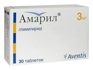 Показания к применению— сахарный диабет 2 типа (в качестве монотерапии или в составе комбинированной терапии с метформином или инсулином).Применение при беременности и кормлении грудьюАмарил противопоказан к применению при беременности. В случае планируемой беременности или при наступлении беременности женщину следует перевести на инсулинотерапию. Установлено, что глимепирид выделяется с грудным молоком. В период лактации следует перевести женщину на инсулин или прекратить грудное вскармливание.Противопоказания— сахарный диабет 1 типа; — диабетический кетоацидоз, диабетическая прекома и кома; — тяжелые нарушения функции печени (отсутствие клинического опыта применения); — тяжелые нарушения функции почек, в т.ч. пациенты, находящиеся на гемодиализе (отсутствие клинического опыта применения); — беременность; — лактация (грудное вскармливание); — детский возраст (отсутствие клинического опыта применения); — редкие наследственные заболевания, такие как непереносимость галактозы, недостаточность лактазы или глюкозо-галактозная мальабсорбция; — повышенная чувствительность к компонентам препарата; — повышенная чувствительность к другим производным сульфонилмочевины и сульфаниламидным препаратам (риск развития реакций гиперчувствительности). С осторожностью следует применять препарат в первые недели лечения (повышенный риск развития гипогликемии); при наличии факторов риска для развития гипогликемии (может потребоваться коррекция дозы глимепирида или всей терапии); при интеркуррентных заболеваниях во время лечения или при изменении образа жизни пациентов (изменение диеты и времени приема пищи, увеличение или уменьшение физической активности); при недостаточности глюкозо-6-фосфатдегидрогеназы; при нарушениях всасывания пищи и лекарственных средств из ЖКТ (кишечная непроходимость, парез кишечника).СоставГлимепирид 3 мг Вспомогательные вещества: лактозы моногидрат — 136.95 мг, карбоксиметилкрахмал натрия (тип А) — 8 мг, повидон 25 000 — 1 мг, целлюлоза микрокристаллическая — 20 мг, магния стеарат — 1 мг, краситель железа оксид желтый (Е172) — 0.05 мг.