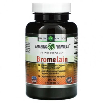 Amazing Formulas™Пищевая добавкаПротеолитический фермент — поддерживает переваривание белковПротивовоспалительные свойства поддерживают здоровье суставовПоддерживает усвоение питательных веществПродукт производится в соответствии со стандартом надлежащей производственной практики (GMP)Мы уверены, что Amazing Nutrition® — важный компонент здорового образа жизни. Мы рады предложить вам лучший выбор продуктов, которые идеально подходят для здорового питания и активного образа жизни.Бромелаин — это протеолитический фермент, который получают из стеблей ананаса. При приеме между приемами пищи противовоспалительные свойства бромелаина могут помочь уменьшить боль, отек и жесткость в суставах, вызванные воспалением. Это также может помочь уменьшить отек носовых пазух и облегчить симптомы у людей с инфекциями носовых пазух. При приеме во время еды бромелаин способствует здоровому пищеварению, помогая организму быстрее переваривать белки и питательные вещества.