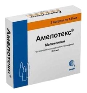 Показания к применению остеоартроз, ревматоидный артрит, анкилозирующий спондилоартрит (болезнь Бехтерева), воспалительные и дегенеративные заболевания суставов, сопровождающиеся болевым синдромом (для раствора д/в/м введения). Предназначен для симптоматической терапии, уменьшения боли и воспаления на момент использования, на прогрессирование заболевания не влияет.Применение при беременности и кормлении грудьюПрепарат противопоказан при беременности и в период лактации (грудного вскармливания). Подавление синтеза простагландинов может оказывать нежелательное воздействие на течение беременности и развитие плода. Известно, что НПВП проникают в грудное молоко, поэтому Амелотекс не рекомендуется применять в период грудного вскармливания. Применение мелоксикама, как и других препаратов, блокирующих синтез простагландинов, может влиять на фертильность, поэтому он не рекомендуется женщинам, планирующим беременность.Состав1 таб. Мелоксикам 1.5 мг. Вспомогательные вещества: натрия гидроксид — 1.783 мг, натрия хлорид — 6.9 мг, вода д/и — 988.317 мг.