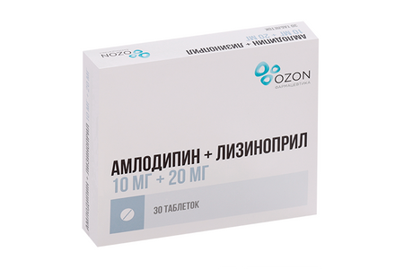 Амлодипин+Лизиноприл 10 мг+20 мг, 30 шт, таблетки
