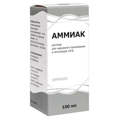 Раствор для местного применения и ингаляций 10% прозрачный, бесцветный, летучий, с резким запахом. Фармакологическое действие Раздражающее и отвлекающее средство. При вдыхании рефлекторно оказывает возбуждающее влияние на дыхательный центр, действуя через рецепторы верхних дыхательных путей (окончания тройничного нерва). При наружном применении оказывает противомикробное действие и хорошо очищает кожу. Показания активных веществ препарата Аммиак Ингаляционное применение: в качестве средства скорой помощи для возбуждения дыхания и выведения больных из обморочного состояния. Внутрь: в качестве отхаркивающего средства (в составе комбинированного препарата). Наружно: в виде примочек, для мытья рук в хирургической практике.