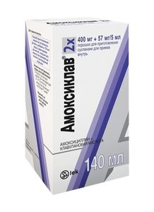 Показания к применениюИнфекции, вызванные чувствительными штаммами микроорганизмов:- инфекции верхних дыхательных путей и ЛОР-органов (в т.ч. острый и хронический синусит, острый и хронический средний отит, заглоточный абсцесс, тонзиллит, фарингит);- инфекции нижних отделов дыхательных путей (в т.ч. острый бронхит с бактериальной суперинфекцией, хронический бронхит, пневмония);- инфекции мочевыводящих путей;- гинекологические инфекции;- инфекции кожи и мягких тканей, включая укусы животных и человека;- инфекции костной и соединительной ткани;- инфекции желчных путей (холецистит, холангит);- одонтогенные инфекции.Применение при беременности и кормлении грудьюАмоксиклав можно назначать при беременности при наличии четких показаний.Амоксициллин и клавулановая кислота в небольших количествах выделяются с грудным молоком.Противопоказания- повышенная чувствительность к любому из компонентов препарата;- повышенная чувствительность в анамнезе к пенициллинам, цефалоспоринам и другим бета-лактамным антибиотикам;- наличие в анамнезе указаний на холестатическую желтуху и/или другие нарушения функции печени, вызванные приемом амоксициллина/клавулановой кислоты;- инфекционный мононуклеоз и лимфолейкоз.Побочное действиеСо стороны пищеварительной системы: потеря аппетита, тошнота, рвота, диарея; редко — боли в животе, нарушения функции печени, повышение активности печеночных ферментов (АЛТ или АСТ); в единичных случаях — холестатическая желтуха, гепатит, псевдомембранозный колит.Аллергические реакции: зуд, крапивница, эритематозная сыпь; редко — многоформная экссудативная эритема, ангионевротический отек, анафилактический шок, аллергический васкулит; в единичных случаях — эксфолиативный дерматит, синдром Стивенса-Джонсона, острый генерализованный экзантематозный пустулез.Со стороны системы кроветворения и лимфатической системы: редко — обратимая лейкопения (включая нейтропению), тромбоцитопения; очень редко — гемолитическая анемия, обратимое увеличение протромбинового времени (при совместном применении с антикоагулянтами), эозинофилия, панцитопения.Со стороны нервной системы: головокружение, головная боль; очень редко — судороги (могут проявляться у пациентов с нарушениями функции почек при приеме препарата в высоких дозах), гиперактивность, чувство тревоги, бессонница.Со стороны мочевыделительной системы: очень редко — интерстициальный нефрит, кристаллурия.Прочие: редко — развитие суперинфекции (в т.ч. кандидоз).СоставВ 5 мл готовой сусп содержится: Амоксициллин (в форме тригидрата) 400 мгКлавулановая кислота (в форме калиевой соли) 57 мгВспомогательные вещества: лимонная кислота (безводная) — 2.694 мг, натрия цитрат (безводный) — 8.335 мг, целлюлоза микрокристаллическая и кармеллоза натрия — 28.1 мг, камедь ксантановая — 10 мг, кремния диоксид коллоидный — 16.667 мг, кремния диоксид — 217 мг, ароматизатор дикой вишни — 4 мг, ароматизатор лимонный — 4 мг, натрия сахаринат — 5.5 мг, маннитол — 1250 мг.