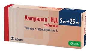 Показания к применению— артериальная гипертензия (пациентам, которым показана комбинированная терапия).Применение при беременности и кормлении грудьюПрепарат противопоказан при беременности. При наступлении беременности прием препарата следует немедленно прекратить.;При необходимости применения препарата в период лактации следует решить вопрос о прекращении грудного вскармливания.ПротивопоказанияРамиприл;— ангионевротический отек в анамнезе (в т.ч. связанный с предшествующей терапией ингибиторами АПФ); — гемодинамически значимый двусторонний стеноз почечных артерий; — стеноз артерии единственной почки; — состояние после трансплантации почек; — гемодиализ; — почечная недостаточность (КК<30 мл/мин); — гемодинамически значимый аортальный или митральный стеноз (риск чрезмерного снижения АД с последующим нарушением функции почек); — гипертрофическая обструктивная кардиомиопатия; — первичный гиперальдостеронизм; — беременность; — период лактации; — детский и подростковый возраст до 18 лет (эффективность и безопасность не установлены); — повышенная чувствительность к ингибиторам АПФ; — повышенная чувствительность к рамиприлу и/или компонентам препарата.;С осторожностью следует назначать препарат при тяжелых поражениях коронарных и церебральных артерий (опасность снижения кровотока при чрезмерном снижении АД), нестабильной стенокардии, тяжелых желудочковых нарушения ритма, хронической сердечной недостаточности IV стадии, декомпенсированном легочном сердце, почечной и/или печеночной недостаточности, гиперкалиемии, гипонатриемии (в т.ч. на фоне применения диуретиков и диеты с ограничением потребления соли), состояниях, сопровождающихся снижением ОЦК (в т.ч. диарея, рвота), системных заболеваниях соединительной ткани (в т.ч. склеродермия и СКВ), заболеваниях, требующих назначения ГКС и иммунодепрессантов (отсутствие клинического опыта), сахарном диабете, угнетении костномозгового кроветворения, пациентам пожилого возраста.;Гидрохлоротиазид;— подагра; — сахарный диабет (тяжелые формы); — хроническая почечная недостаточность (КК<20-30 мл/мин, анурия); — тяжелая печеночная недостаточность; — рефрактерная гипокалиемия; — гиперкальциемия; — гипонатриемия; — беременность; — период лактации; — детский возраст до 3 лет (для таблеток); — повышенная чувствительность к сульфонамидам в анамнезе; — повышенная чувствительность к компонентам препарата.;С осторожностью следует принимать препарат при гипокалиемии, гипонатриемии, гиперкальциемии, ИБС, печеночной недостаточности, циррозе печени, бронхиальной астме в анамнезе, у пациентов пожилого возраста.СоставРамиприл 5 мг;гидрохлоротиазид 25 мг;Вспомогательные вещества: натрия гидрокарбонат, лактозы моногидрат, кроскармеллоза натрия, крахмал прежелатинизированный (крахмал 1500), натрия стеарилфумарат.