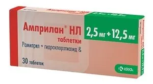 Показания к применению— артериальная гипертензия (пациентам, которым показана комбинированная терапия).Применение при беременности и кормлении грудьюПрепарат противопоказан при беременности. При наступлении беременности прием препарата следует немедленно прекратить.;При необходимости применения препарата в период лактации следует решить вопрос о прекращении грудного вскармливания.ПротивопоказанияРамиприл;— ангионевротический отек в анамнезе (в т.ч. связанный с предшествующей терапией ингибиторами АПФ); — гемодинамически значимый двусторонний стеноз почечных артерий; — стеноз артерии единственной почки; — состояние после трансплантации почек; — гемодиализ; — почечная недостаточность (КК<30 мл/мин); — гемодинамически значимый аортальный или митральный стеноз (риск чрезмерного снижения АД с последующим нарушением функции почек); — гипертрофическая обструктивная кардиомиопатия; — первичный гиперальдостеронизм; — беременность; — период лактации; — детский и подростковый возраст до 18 лет (эффективность и безопасность не установлены); — повышенная чувствительность к ингибиторам АПФ; — повышенная чувствительность к рамиприлу и/или компонентам препарата.;С осторожностью следует назначать препарат при тяжелых поражениях коронарных и церебральных артерий (опасность снижения кровотока при чрезмерном снижении АД), нестабильной стенокардии, тяжелых желудочковых нарушения ритма, хронической сердечной недостаточности IV стадии, декомпенсированном легочном сердце, почечной и/или печеночной недостаточности, гиперкалиемии, гипонатриемии (в т.ч. на фоне применения диуретиков и диеты с ограничением потребления соли), состояниях, сопровождающихся снижением ОЦК (в т.ч. диарея, рвота), системных заболеваниях соединительной ткани (в т.ч. склеродермия и СКВ), заболеваниях, требующих назначения ГКС и иммунодепрессантов (отсутствие клинического опыта), сахарном диабете, угнетении костномозгового кроветворения, пациентам пожилого возраста.;Гидрохлоротиазид;— подагра; — сахарный диабет (тяжелые формы); — хроническая почечная недостаточность (КК<20-30 мл/мин, анурия); — тяжелая печеночная недостаточность; — рефрактерная гипокалиемия; — гиперкальциемия; — гипонатриемия; — беременность; — период лактации; — детский возраст до 3 лет (для таблеток); — повышенная чувствительность к сульфонамидам в анамнезе; — повышенная чувствительность к компонентам препарата.;С осторожностью следует принимать препарат при гипокалиемии, гипонатриемии, гиперкальциемии, ИБС, печеночной недостаточности, циррозе печени, бронхиальной астме в анамнезе, у пациентов пожилого возраста.СоставРамиприл 2.5 мг;гидрохлоротиазид 12.5 мг;Вспомогательные вещества: натрия гидрокарбонат, лактозы моногидрат, кроскармеллоза натрия, крахмал прежелатинизированный (крахмал 1500), натрия стеарилфумарат.