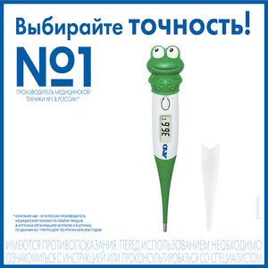 Электронный термометр (или градусник) AND DT-624, Лягушонок, предназначен для измерения температуры тела человека тремя способами: орально, в подмышечной впадине (аксиллярно) или ректально. Время измерения около 60 сек. Прибор отличает яркий и необычный дизайн, который выполнен в виде забавного лягушонка, наверняка, понравится детям.Отличительные особенности: Способы измерения: аксиллярный (подмышкой), оральный, ректальный Время измерения: около 60 сек. Электронный, не содержит ртути Яркий дизайн, специально для детей Съёмная насадка-держатель в виде лягушонка 1000 измерений от одного элемента питания С гибким нетравмирующим наконечником Влагозащита датчика Информативный звуковой сигнал окончания измерения Память последнего измерения Сменная батарейка Автоматическое выключение через 10 мин. после использования для увеличения срока службы элемента питания Пределы допускаемой погрешности измерений: +/- 0,1 °С Футляр для хранения Срок гарантии 1 годТехнические характеристики: Наименование, модель: Термометр электронный, медицинский, AND DT-624, лягушонок Тип датчика: Терморезистор Метод измерения: Фактическое измерение (не прогнозирование) Способ измерения: ректальный, оральный или аксиллярный Время измерения: не менее 60 сек. Индикатор температуры: 3-разрядный (°C), отображение температуры с дискретностью 0,1 градуса Пределы допускаемой погрешности: ± 0,1 °C (32,0 — 43,0 °C) Диапазон измерений температуры: от 32,0 до 43,0 °C Звуковой сигнал: Есть, оповещает об окончании минимального времени измерения (Измерение продолжается даже после подачи звукового сигнала) Автоматическое отключение: Есть (Термометр автоматически выключится через 10 минут после использования) Гибкий наконечник: Есть Водонепроницаемый корпус: Есть Память: Есть (отображение последнего измерения) Источник питания: 1 алкалиновая батарейка типа LR41 Срок службы элемента питания: не менее 100 часов Футляр для хранения: Есть Размеры прибора: 140 X 40 X 20 мм Вес прибора: 24 грамм (с установленной батареей и держателем) Особенности: модель с оригинальным дизайном