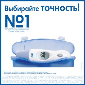 Инфракрасный термометр AND DT-635 идеально подходит для домашнего использования, когда значение температуры желательно получить мгновенно. Измерение проводится за 1 секунду методом регистрации инфракрасного излучения барабанной перепонки или области лба. Незаменим при измерении температуры у детей, позволяет быстро и безболезненно измерить температуру ребенку, не беспокоя его.Даже опытные родители сетуют на то, как трудно измерить температуру у ребенка. Измерение обычным термометром вызывает у детей бурный протести. Электронный термометр Эй энд Ди поможет быстро и безопасно сделать измерения, важно правильно воспользоваться прибором.Для измерения температуры слегка оттяните ушную раковину и аккуратно введите датчик термометра в слуховой канал, направив его на барабанную перепонку. Результат измерений высветиться на дисплее через оду секунду.Чтобы измерить температуру у грудного ребенка (в возрасте до года), уложите его так, чтобы ухо было обращено вверх.Регулярные наблюдения за температурой ребенка помогут Вам понять, действительно ли ребенок болен, или это случайное временное повышение температуры. Вы не забудете результат последнего измерения, т.к. он автоматически выводится на дисплей при включении термометра.Функциональные особенности Измерение температуры методом регистрации инфракрасного излучения Время измерения 1 секунда Два способа измерения температуры тела: в ухе и на лбу Бесконтактное измерение температуры окружающих объектов и воздуха Звуковые сигналы: об окончании измерения и при температуре выше 38°C Большой дисплей Память последнего измерения Влагозащита датчика Функции часов и комнатного термометра Диапазон измерения: от 0°C до 50°C Точность измерения: ±0,1°C в диапазоне от 32°C до 43°C Автоматическое отключение Питание от 1 элемента CR2032 Удобный кейс-подставка для хранения и переноски