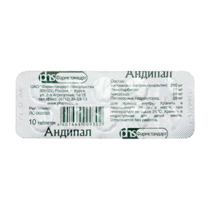 Андипал – комбинированный препарат, который содержит бендазол, метамизол натрия, папаверин и фенобарбитал. Наличие в препарате фенобарбитала способствует проявлению седативного эффекта и усилению действия других компонентов.Используется при спазмах периферических сосудов и сосудов головного мозга. Снижает артериальное давление, улучшает коллатеральное кровообращение.Комбинация действующих веществ усиливает обезболивающее действие при головной боли, мигрени. Препарат используют при болевых синдромах, связанных со спазмом периферических артерий, гладкой мускулатуры желудочно-кишечного тракта, сосудов головного мозга, а также при повышении артериального давления.Отпускают без рецепта.
