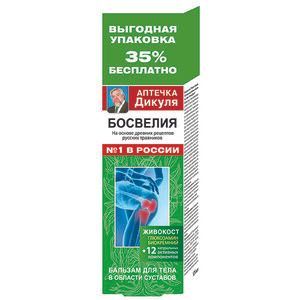Аптечка Дикуля Живокост (босвелия) бальзам/тела Органолептика (консистенция, цвет, запах): Консистенция умеренно густая, цвет от белого до кремового, запах нейтральный Специальные особенности: Средство содержит минимальную дозу консервантов и совсем не имеет искусственных ароматизаторов, парфюмерных отдушек и прочих примесей. Это означает, что оно на 90 % состоит из натуральных компонентов.Окопник- лекарственное растение уникальное по лечебному воздействию на кости и суставы. Снимает воспаление и отеки, а главное- активизирует процессы обновления и регенерации хряща.Босвелия-ладанное дерево, обладает выраженным противовоспалительным, антисептическим свойством. Используется при ревматизме и других заболеваниях суставов, тормозит воспалительные процессы в суставах, способствует восстановлению поврежденных сосудов и улучшению питания в суставах.Золотой ус- является мощным биогенным стимулятором, который усиливает действие всех компонентов, входящих в состав композиции.Комплекс экстрактов лекарственных растений, составленных по принципу синергизма, обладает противовоспалительным действием, способствует выведению солей, снятию отека и мышечного спазма, активирует кровообращение и улучшает трофику тканей.Хондроитина сульфат-важная составляющая часть хряща, эффективный хондопротектор. Активизирует процессы регенерации хряща, повышает содержание влаги в хрящевой ткани, предупреждая ее высыхание, сохраняя упругость и эластичность.Мумие-мощный биостимулятор, богатый активными веществами. Замедляет процесс старения сустава, ускоряет восстановление костей и суставов, способствует уменьшению ломоты, возникающей при перемене погоды.Результат: Активизация кровообращения, нормализация метаболизма в тканях, сохранение здорового функционального состояния, торможение деструктивных процессов.