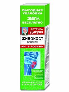 Аптечка Дикуля Живокост (окопник) бальзам/тела — консистенция умеренно густая, цвет от белого до кремового, запах нейтральныйОкопник- лекарственное растение уникальное по лечебному воздействию на кости и суставы. Снимает воспаление и отеки, а главное- активизирует процессы обновления и регенерации хряща.Золотой ус-является мощным биогенным стимулятором, который усиливает действие всех компонентов, входящих в состав композиции.Комплекс экстрактов лекарственных растений, составленных по принципу синергизма, обладает противовоспалительным действием, способствует выведению солей, снятию отека и мышечного спазма, активирует кровообращение и улучшает трофику тканей.Хондроитина сульфат-важная составляющая часть хряща, эффективный хондопротектор. Активизирует процессы регенерации хряща, повышает содержание влаги в хрящевой ткани, предупреждая ее высыхание, сохраняя упругость и эластичность.Мумие-мощный биостимулятор, богатый активными веществами. Замедляет процесс старения сустава, ускоряет восстановление костей и суставов, способствует уменьшению ломоты, возникающей при перемене погодыСредство содержит минимальную дозу консервантов и совсем не имеет искусственных ароматизаторов, парфюмерных отдушек и прочих примесей. Это означает, что оно на 90 % состоит из натуральных компонентов.Результат: Активизация кровообращения, нормализация метаболизма в тканях, сохранение здорового функционального состояния, торможение деструктивных процессов