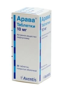Показания к применениюКак базисное средство для лечения взрослых больных с активной формой ревматоидного артрита с целью уменьшения симптомов заболевания и задержки развития структурных повреждений суставов. Активная форма псориатического артрита.ПротивопоказанияПрепарат Арава не должен использоваться у больных с гиперчувствительностью к лефлуномиду или любому другому компоненту препарата. Препарат противопоказан: у больных с нарушениями функции печени; у больных с тяжелым иммунодефицитом (например, СПИД); у больных со значительными нарушениями костномозгового кроветворения или с выраженной анемией, лейкопенией или тромбоцитопенией в результате других причин (кроме ревматоидного артрита); у больных с тяжелыми, неконтролируемыми инфекциями; у больных с умеренной или тяжелой почечной недостаточностью (ввиду малого опыта клинического наблюдения); у больных с тяжелой гипопротеинемией (например, при нефротическом синдроме); у беременных или женщин детородного возраста, не пользующихся надежной контрацепцией в период лечения лефлуномидом , и затем до тех пор, пока плазменный уровень активного метаболита остается выше 0,02 мг/л (см. “Беременность и кормление грудью”). Беременность должна быть исключена перед началом лечения лефлуномидом.Противопоказан прием лефлуномида в период грудного вскармливания (см. “Беременность и кормление грудью”.) Мужчины, получающие лечение лефлуномидом, должны быть предупреждены о возможном фетотоксическом действии препарата (связанном с его возможным влиянием на сперматозоиды отца) и о необходимости применения надежых средств контрацепции. Арава не рекомендуется к использованию у пациентов младше 18 лет, так как данные об эффективности и безопасности в этой группе больных отсутствуют.Состав1 таб.лефлуномид 10 мгВспомогательные вещества: лактозы моногидрат — 78 мг, крахмал кукурузный — 50 мг, повидон K25 (поливидон К25) — 3.5 мг, кремния диоксид коллоидный — 500 мкг, магния стеарат — 500 мкг, кросповидон — 7.5 мг.Состав пленочной оболочки: гипромеллоза (метилгидроксипропилцеллюлоза 5 mPa.s) — 2.521 мг, макрогол 8000 — 160 мкг, титана диоксид (Е171) — 630 мкг, тальк — 189 мкг.