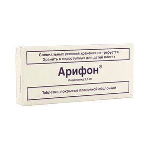Показания к применениюЭссенциальная артериальная гипертензия.Применение при беременности и кормлении грудьюКак правило, при беременности не следует назначать диуретические препараты. Не следует использовать эти препараты для лечения физиологических отеков при беременности. Диуретические препараты могут вызывать фетоплацентарную ишемию и приводить к нарушению развития плода.В связи с тем, что индапамид выделяется с грудным молоком, не рекомендуется назначение препарата в период грудного вскармливания.ПротивопоказанияТяжелая почечная недостаточность; печеночная энцефалопатия; гипокалиемия; повышенная чувствительность к производным сульфонамидов. Следует избегать одновременного приема Арифона и препаратов, удлиняющих интервал QTПобочное действиеСо стороны системы крови и лимфатической системыОчень редко — тромбоцитопения, лейкопения, агранулоцитоз, апластическая анемия, гемолитическая анемия. неврологические расстройстваРедко — головокружение (вертиго), утомляемость, головная боль, парестезии; частота неизвестна — обморок. кардиальные нарушенияОчень редко — аритмия, артериальная гипотензиячастота неизвестна — пароксизмальная желудочковая тахикардия типа «пируэт» ( torsades de pointes ), что может привести к летальному исходу. Желудочно-кишечные расстройстваНечасто — рвотаредко — тошнота, запор, сухость во ртуочень редко — панкреатит. Со стороны мочевыделительной системыОчень редко — почечная недостаточность. Со стороны пищеварительной системыОчень редко — нарушение функции печеничастота неизвестна — при печеночной недостаточности возможно возникновение печеночной энцефалопатии, гепатит. Со стороны кожи и подкожной клетчаткиРеакции гиперчувствительности, главным образом со стороны кожи, у пациентов, имеющих склонность к аллергическим и астматическим реакциям: часто — макулопапулезная сыпь; нечасто — пурпураочень редко — ангионевротический отек и / или крапивница, токсический эпидермальный некролиз, синдром Стивенса-Джонсоначастота неизвестна — возможно обострение существующего острого системной красной волчанки; сообщалось о случаях реакций фоточувствительности.СоставДействующее вещество: Индапамид (Indapamide)Концентрация действующего вещества (мг): 2,5
