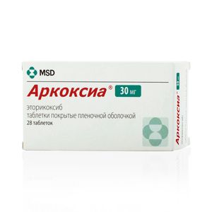Показания к применениюСимптоматическая терапия остеоартроза, ревматоидного артрита, анкилозирующего спондилита; боль и симптомы воспаления, связанные с острым подагрическим артритом; краткосрочное лечение боли, связанной с проведением стоматологической операции.Применение при беременности и кормлении грудьюПрепарат противопоказан при беременности и в период лактации. Эторикоксиб может отрицательно влиять на женскую фертильность и не рекомендуется женщинам, планирующим беременность.ПротивопоказанияПолное или неполное сочетание бронхиальной астмы, рецидивирующего полипоза носа или околоносовых пазух и непереносимости ацетилсалициловой кислоты и других НПВП (в т.ч. в анамнезе). Эрозивно-язвенные изменения слизистой оболочки желудка или двенадцатиперстной кишки, активное желудочно-кишечное кровотечение, цереброваскулярное или иное кровотечение. Воспалительные заболевания кишечника (болезнь Крона, неспецифический язвенный колит) в фазе обострения. Гемофилия и другие нарушения свертываемости крови. Выраженная сердечная недостаточность (II-IV функциональные классы по классификации NYHA). Выраженная печеночная недостаточность (более 9 баллов по шкале Чайлд-Пью) или активное заболевание печени. Почечная недостаточность тяжелой степени (КК менее 30 мл/мин), прогрессирующие заболевания почек, подтвержденная гиперкалиемия. Период после проведения аортокоронарного шунтирования; заболевания периферических артерий, цереброваскулярные заболевания, клинически выраженная ИБС. Устойчивая артериальная гипертензия при значениях АД более 140/90 мм рт. ст. Беременность, период лактации (грудного вскармливания). Детский и подростковый возраст до 16 лет. Повышенная чувствительность к эторикоксибу.СоставЭторикоксиб 30 мг Вспомогательные вещества: кальция гидрофосфат 30 мг, целлюлоза микрокристаллическая 37 мг, кроскармеллоза натрия 2 мг, магния стеарат 1 мг. Состав оболочки: Опадрай II Сине-Зеленый 39К11526, воск карнаубский. Состав пленочной оболочки: лактозы моногидрат, гипромеллоза, титана диоксид, триацетин, алюминиевый лак на основе красителя индигокармина (Е132), краситель железа оксид желтый (Е172).