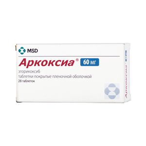Показания к применениюПрепарат Аркоксиа применяют для симптоматического лечения таких заболеваний и состояний, как: ревматоидный артрит; острый подагрический артрит; анкилозирующий спондилит; остеоартроз. Препарат также назначают после стоматологических операций для лечения выраженной острой и умеренной боли. Противопоказания Абсолютные: обострения воспалительных заболеваний кишечника (неспецифический язвенный колит и болезнь Крона); тяжелая недостаточность функции почек (клиренс креатинина менее 30 мл/мин), подтвержденная гиперкалиемия, прогрессирующие почечные заболевания; активное желудочно-кишечное, цереброваскулярное или другое кровотечение; эрозивно-язвенные поражения слизистой оболочки 12-перстной кишки или желудка; тяжелая печеночная недостаточность, заболевания печени в активной фазе; стойко сохраняющееся повышенное артериальное давление при неконтролируемой артериальной гипертензии; нарушения свертываемости крови (в том числе гемофилия); клинически выраженная ишемическая болезнь сердца, цереброваскулярные заболевания и заболевания периферических артерий, период после АКШ (аортокоронарного шунтирования); выраженная сердечная недостаточность; неполное или полное сочетание следующих заболеваний (в том числе в анамнезе): рецидивирующий полипоз носа или околоносовых пазух, бронхиальная астма и непереносимость ацетилсалициловой кислоты и других НПВС; детский и подростковый возраст до 16 лет; период беременности и кормления грудью; гиперчувствительность к любому из компонентов препарата. Относительные (Аркоксиа применяют с осторожностью): тяжелые соматические заболевания; наличие в анамнезе данных о развитии язвенного поражения желудочно-кишечного тракта и инфекции Хеликобактер пилори; артериальная гипертензия; сахарный диабет; отеки и задержка жидкости; дислипидемия/гиперлипидемия; почечная недостаточность (при клиренсе креатинина менее 60 мл/мин); курение; частое употребление алкоголя; пожилой возраст; длительное использование НПВС; сопутствующая терапия антиагрегантами, глюкокортикостероидами, антикоагулянтами и селективными ингибиторами обратного захвата серотонинаПрименение при беременности и кормлении грудьюПрепарат противопоказан при беременности и в период лактации. Применение препарата может отрицательно влиять на женскую фертильность и не рекомендуется женщинам, планирующим беременностьСоставСостав 1 таблетки: действующее вещество: эторикоксиб. Вспомогательные вещества: кальция гидрофосфат, целлюлоза микрокристаллическая, кроскармеллоза натрия, магния стеарат. Состав оболочки: опадрай II белый 39К18305, воск карнаубский. Состав пленочной оболочки: лактозы моногидрат, гипромеллоза, титана диоксид, триацетин.