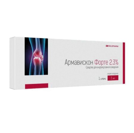 Область применения — ортопедия, ревматология, травматология, хирургия, спортивная медицина. Терапия при тяжелой стадии остеоартрита.Средство Армавискон Форте является протектором синовиальной жидкости сустава. Применяется на фоне дегенеративных изменений поверхности синовиального хряща для улучшения подвижности суставов, уменьшения болевого синдрома, снижения воспалительных реакций и восстановления гомеостаза в хряще.Свойства и эффективностьСредство оказывает анальгезирующее, корректирующее действие на метаболизм костной и хрящевой ткани.Армавискон Форте представляет собой стерильный вязкий раствор натриевой соли гиалуроновой кислоты (натрия гиалуроната) высокой степени очистки, высокомолекулярный. Гиалуроновая кислота — необходимый компонент экстрацеллюлярного матрикса, присутствует в высоких концентрациях в составе хряща и синовиальной жидкости. Гиалуроновая кислота обеспечивает вязкость и эластичность синовиальной жидкости, а также она необходима для формирования хряща. При остеоартрозе отмечаются дефицит и качественные изменения гиалуроновой кислоты в составе синовиальной жидкости и хряща. Внутрисуставное введение гиалуроновой кислоты приводит к улучшению функционального состояния сустава. При использовании средства Армавискон Форте при остеоартрозе коленного сустава отмечается улучшение клинического течения остеоартроза до шести месяцев с момента применения, наблюдается противовоспалительный и анальгетический эффект за счет восполнения объема и восстановления вязкости и эластичности синовиальной жидкости, которая заполняет полость сустава и выполняет роль внутрисуставной смазки. Она предотвращает трение суставных поверхностей, что позволяет устранить болевые ощущения и воспаление. А также защищает от преждевременного изнашивания и разрушения гиалинового хряща, обеспечивает подвижность, имеет амортизационные способности (гасит внешние удары, защищая компоненты сустава от повреждения).Раствор натрия гиалуроната распределяется местно в полости сустава, где он подвергается локальным преобразованиям, оказывая смазывающее действие.Извлечение или замена средства неприменима, так как он неотделимо смешивается с синовиальной жидкостью сустава.Армавискон Форте представляет собой бесцветный вязкий раствор.