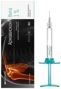 Средство для внутрисуставного введения Армавискон® Вита (далее — средство) представляет собой бесцветный вязкий раствор.Свойства и эффективностьСредство оказывает анальгезирующее, корректирующее действие на метаболизм костной и хрящевой ткани.Армавискон® Вита представляет собой стерильный вязкий раствор натриевой соли гиалуроновой кислоты (натрия гиалуроната) высо¬кой степени очистки, высокомолекулярный (молекулярная масса составляет не менее 3 МДа). Гиалуроновая кислота – необходимый компонент экстрацеллюлярного матрикса, присутствует в высоких концентрациях в составе хряща и синовиальной жидкости. Гиалу¬роновая кислота обеспечивает вязкость и эластичность синовиаль¬ной жидкости, а также она необходима для формирования хряща. При остеоартрозе отмечаются дефицит и качественные изменения гиалуроновой кислоты в составе синовиальной жидкости и хряща. Внутрисуставное введение гиалуроновой кислоты приводит к улуч¬шению функционального состояния сустава. При использовании средства Армавискон® Вита при остеоартрозе коленного сустава отмечается улучшение клинического течения остеоартроза до ше¬сти месяцев с момента применения, наблюдается противовоспа¬лительный и анальгетический эффект за счет восполнения объема и восстановления вязкости и эластичности синовиальной жидкости, которая заполняет полость сустава и выполняет роль внутрисустав¬ной смазки. Она предотвращает трение суставных поверхностей, что позволяет устранить болевые ощущения и воспаление, а также защищает от преждевременного изнашивания и разрушения гиали¬нового хряща, обеспечивает подвижность, имеет амортизационные способности (гасит внешние удары, защищая компоненты сустава от повреждения).Раствор натрия гиалуроната распределяется местно в полости су¬става, где он подвергается локальным преобразованиям, оказывая смазывающее действие.Извлечение или замена средства неприменима, так как он неотделимо смешивается с синовиальной жидкостью сустава.