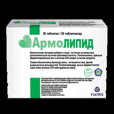 АрмоЛИПИД — биологически активная добавка к пище — источник астаксантина, дополнительный источник фолиевой кислоты.Поликосанолы, красный ферментированный рис и коэнзим Q10 входят в состав продукта.Кардиоваскулярный рискСердечно-сосудистые и цереброваскулярные заболевания являются основной причиной смерти и инвалидности во всем мире. Гиперхолестеринемия является независимым фактором риска сердечно-сосудистых заболеваний. Недавние научные исследования показали, что:• Любой уровень холестерина липопротеинов низкой плотности (ЛПНП) выше рекомендуемого значения связан с повышенным риском сердечно-сосудистых событий.• Снижение холестерина ЛПНП до оптимальных концентраций снижает этот риск• Независимым фактором риска сердечно-сосудистых заболеваний является высокий уровень гомоцистеина в крови, состояние, которое может развиться в случае дефицита фолиевой кислоты• Окислительный стресс, вызванный повышенным количеством свободных радикалов в организме из-за неправильного питания, курения, интенсивных физических нагрузок и заболеваний, оказывает проатерогенное действие, повышает риск неблагоприятного исхода сердечно-сосудистых заболеваний.Важной причиной развития атеросклероза является чрезмерное или несбалансированное питание, которое приводит к повышению уровня холестерина в крови, изменяет липидный профиль и определяет недостаточность жизненно важных факторов питания. Изменения в образе жизни (физические упражнения, здоровое питание и отказ от курения) являются краеугольным камнем в профилактике сердечно-сосудистых заболеваний.Для улучшения липидного профиля плазмы у пациентов с дислипидемией в современных руководствах рекомендуется использовать пищевые добавки и нутрицевтики (такие как красный дрожжевой рис и поликозанол), которые можно использовать в качестве альтернативы или в дополнение к гиполипидемическим препаратам в определенных условиях.Красный дрожжевой рисКрасный ферментированный (дрожжевой) рис является продуктом ферментации гриба Monascus purpureus и содержит монаколин К, который способен модулировать уровень липидов в крови. В АрмоЛИПИДе красный дрожжевой рис получают в стандартных условиях с определенным штаммом Monascus purpureus, выбранный для оптимального уровня выхода монаколина K (основного активного ингредиента красного дрожжевого риса), с четко определенным и гарантированным анализом титра. Экспериментальные и клинические исследования показали, что красный дрожжевой рис снижает общий холестерин и ЛПНП-холестерин.ПоликосанолыПоликоcанолы представляют собой смесь натуральных (природных) жирных спиртов, содержащихся в восковой матрице сахарного тростника (Saccharum officinarum), рисовых отрубях (Oryza sativa) и пчелином воске (Apis mellifera). Поликоcанолы, содержащиеся в АрмоЛИПИДе, получены из сахарного тростника. Поликоcанолы повышают эффективность контроля холестерина в крови.Фолиевая кислотаФолиевая кислота необходима для многих биохимических функций в организме человека, включая биосинтез нуклеотидов и повторное метилирование гомоцистеина в метионин. Дефицит фолиевой кислоты связан с высоким уровнем гомоцистеина в крови, те. состояния, известного как гипергомоциестеинемия, и признан независимым фактором риска сердечно-сосудистых заболеваний. Организм человека не может синтезиров
