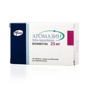 Показания к применениюРаспространенный рак молочной железы у женщин в естественной или индуцированной постменопаузе при прогрессировании заболевания на фоне антиэстрогенной терапии, а также при прогрессировании заболевания после неоднократного применения различных видов гормональной терапии; адъювантная терапия раннего рака молочной железы у женщин в постменопаузе с эстроген-положительными рецепторами или с неизвестным рецепторным статусом, после завершения 2 — 3-летней первоначальной адъювантной терапии тамоксифеном, с целью снижения риска рецидивов (отдаленных или региональных), а также контралатерального рака молочной железы.Применение при беременности и кормлении грудьюАромазин противопоказан к применению при беременности и в период лактации.ПротивопоказанияПовышенная чувствительность к эксеместану или к любому другому компоненту препарата; пременопаузальный эндокринный статус; беременность и период лактации.С осторожностью Нарушение функции печени или почек.Побочное действиеВ общем переносимость Аромазина хорошая; нежелательные эффекты при применении препарата в дозе 25 мг/сут являются незначительными или умеренно выраженными. Ниже перечислены нежелательные реакции, распределенные по системам организма и частоте: очень часто (больше10%), часто (больше1%, меньше10%), нечасто (больше0,1%, меньше1%), редко (больше0,01%, меньше0,1%).Со стороны системы пищеварения: очень часто — тошнота; часто — анорексия, боль в области живота, рвота, запор, диспепсия, диарея.Со стороны центральной и периферической нервной системы: очень часто — бессонница, головная боль; часто — депрессия, головокружение, синдром запястного канала.Со стороны сосудистой системы: очень часто — приливы.Со стороны кожи и кожных придатков: очень часто — потливость; часто — сыпь, алопеция.Со стороны костно-мышечной системы: очень часто — суставные и скелетно-мышечные боли.Прочие: очень часто — повышенная утомляемость; часто — боль неуточненной локализации, периферические отеки или отеки ног.Примерно у 20% больных (особенно у пациенток с исходной лимфопенией) наблюдалось периодическое снижение числа лимфоцитов. Однако, среднее число лимфоцитов у этих больных со временем существенно не менялось, и сопутствующего увеличения заболеваемости вирусными инфекциями не наблюдалось.Иногда наблюдали повышение активности печеночных ферментов и щелочной фосфатазы, преимущественно у пациенток с метастазами в печень и в кости, а также при наличии других поражений печени (не установлено, связаны ли эти изменения с приемом препарата или нет).СоставДействующее вещество: ЭксеместанКонцентрация действующего вещества (мг): 25 мг
