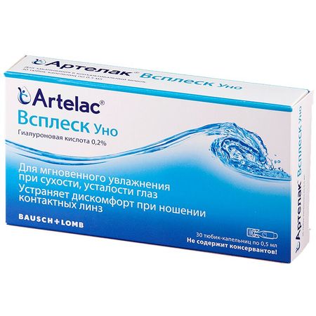 Артелак — зарегистрированная торговая марка фирмы Бауш энд Ломб Инкорпорейтид или ее филиалов.Артелак® Всплеск представляет собой стерильный 0,24 % раствор натрия гиалуроната, не содержащий консервантов. Входящая в состав Артелак® Всплеск гиалуроновая кислота (натрия гиалуронат) является природным увлажняющим веществом с высокой способностью связываться с водой.Описание:Артелак® Всплеск содержит гиалуроновую кислоту (натрия гиалуронат), которая является природным увлажняющим веществом с высокой способностью связываться с водой.Слезная жидкость состоит из трех слоев, которые обеспечивают поверхность глаза питательными веществами, формируют защитный смазывающий барьер между веком и роговицей, а также обеспечивают их нормальное функционирование и четкое зрение.Естественная слезная пленка распределяется по поверхности глаза при каждом моргании, защищая глаза от высыхания и способствуя заживлению поверхностных повреждений роговицы. При нарушении баланса слезной пленки может возникнуть ощущение сухости, жжения, инородного тела в глазу, раздражение и покраснение глаз, ощущение усталости, в некоторых случаях слезотечение.Раствор Артелак® Всплеск увлажняет глаза на долгое время и помогает стабилизировать слезную пленку для обеспечения здорового состояния поверхности глаза.Артелак® Всплеск не содержит консервантов.Преимущества:Раствор увлажняющий офтальмологическийКристально чистый увлажняющий офтальмологический растворНе содержит консервантовСодержит гиалуроновую кислоту — натуральный полимер, который входит в состав естественной слезной пленки здорового глаза человекаПрименяется для предварительного и последующего увлажнения мягких и жестких контактных линз во время их ношенияЛегко применяется, хорошо переносится и безопасен