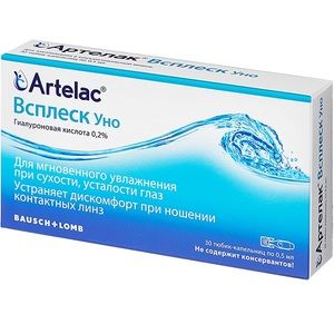 Показания к применению1.Для интенсивного и длительного увлажнения передней поверхности глаза (роговицы и конъюнктивы): -при сухости глаз, вызванной образом жизни, стрессовыми нагрузками на глаза, воздействием факторов окружающей среды, таких как длительная работа за компьютером, и, как следствие, редкое моргание, пребывание в помещении с кондиционированным воздухом, сигаретный дым, а также воздействие ветра при пребывании вне помещения. -при выраженной сухости глаз, вызванной системными заболеваниями, оперативными вмешательствами на глазу или приемом некоторых лекарственных препаратов, таких как противозачаточные средства, антигистаминные препараты, бета-блокаторы, спазмолитики, диуретики. 2.Для устранения дискомфорта при ношении жестких и мягких контактных линз.ПротивопоказанияПовышенная чувствительность к любому из компонентов, входящих в состав раствора (местные аллергические реакции, возникающие в редких случаях). В таких случаях следует прекратить применение препарата.СоставГиалуроновую кислоту в в виде натриевой соли (натрия гиалуронат) 0,2 %, калия хлорид, натрия хлорид, динатрия фосфат додекагидрат, натрия дигидрофосфат дигидрат, вода для инъекцийВзаимодействие с другими препаратамиВ случае совместного применения с офтальмологическими препаратами рекомендуется соблюдать паузу не менее 15 минут между закапыванием раствора Артелак Всплеск Уно и применением глазных капель. Глазные мази всегда должны применяться после закапывания раствора Артелак Всплеск Уно. Глазные мази всегда должны применяться после закапывания раствора Артелак Всплеск Уно.