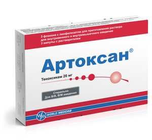 Показания к применению- Ревматоидный артрит,- остеоартрит,- анкилозирующий спондилит,- суставной синдром при обострении течения подагры,- бурсит,- тендовагинит,- болевой синдром (слабой и средней интенсивности): артралгия, миалгия, невралгия, мигрень, зубная и головная боль, альгодисменорея,- боль при травмах, ожогах,Препарат предназначен для симптоматической терапии, уменьшения боли и воспаления на момент использования, на прогрессирование заболевания не влияет.Побочное действиеЧастота развития побочных эффектов классифицирована согласно рекомен­дациям Всемирной организации здравоохранения: очень часто (&gt,1/10), часто (&gt, 1/100, &lt, 1/10), нечасто (&gt, 1/1000, &lt, 1/100), редко (&gt, 1/10000, &lt, 1/1000), очень редко (&lt, 1/10000), не установлено.Со стороны пищеварительной системы: очень часто — диспепсия (тошнота, рвота, изжога, диарея, метеоризм), НПВП-гастропатия, абдоминальные боли, стоматит, анорексия, нарушение функции печени, редко — изъязвление сли­зистой оболочки желудочно-кишечного тракта, кровотечение (желудочно-кишечное, маточное, геморроидальное), перфорация стенок кишечника.Со стороны сердечно-сосудистой системы: редко — сердечная недостаточ­ность, тахикардия, повышение артериального давления.Со стороны центральной нервной системы: часто — головокружение, головная боль, сонливость, депрессия, возбуждение, снижение слуха, шум в ушах, раздражение глаз, нарушение зрения.Нарушения со стороны кожи и подкожной клетчатки: часто — кожный зуд, сыпь, крапивница и эритема, очень редко — фотодерматит, синдром Стивен­са-Джонсона, синдром Лайелла.Нарушения со стороны мочевыделительной системы: часто — повышение содержания азота мочевины и креатинина в крови.Со стороны органов кроветворения: часто — агранулоцитоз, лейкопения, редко — анемия, тромбоцитопения, лейкопения, панцитопения.Нарушения со стороны гепатобилиарной системы: часто — повышение ак­тивности АЛТ, ACT, гамма-ГТ и уровня билирубина в сыворотке.Лабораторные показатели: гиперкреатинииемия, гипербилирубинемия, по­вышение концентрации азота мочевины и активности &quot,печеночных&quot, трансаминаз, удлинение времени кровотечения.На фоне лечения могут наблюдаться психические нарушения и нарушение обмена веществ.СоставКаждый флакон препарата содержит: Действующее вещество: теноксикам — 20 мг. Вспомогательные вещества: маннитол — 80,00 мг, аскорбиновая кислота — 0,400 мг, динатрия эдетат — 0,20 мг, трометамол — 3.30 мг, натрия гидроксид и хлористоводородная кислота — q.s. Каждая ампула растворителя содержит: вода для инъекций — 2 мл.