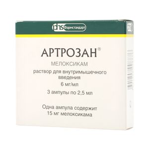 Показания к применениюСимптоматическое лечение воспалительных и дегенеративных заболеваний мышечно-суставной системы, сопровождающихся болевым синдромом, в т.ч.:— остеоартроза;— ревматоидного артрита;— анкилозирующего спондилита (болезнь Бехтерева);— остеохондроза.Применение при беременности и кормлении грудьюПротивопоказан при беременности и в период лактации.Противопоказания— гиперчувствительность к мелоксикаму или вспомогательным компонентам препарата;— декомпенсированная сердечная недостаточность;— ранний послеоперационный период после аортокоронарного шунтирования;— полное или неполное сочетание бронхиальной астмы, рецидивирующего полипоза носа и околоносовых пазух и непереносимости ацетилсалициловой кислоты или других НПВП; обострение язвенной болезни желудка и двенадцатиперстной кишки; активное желудочно-кишечное кровотечение;— воспалительные заболевания кишечника (язвенный колит, болезнь Крона в стадии обострения);— цереброваскулярное кровотечение или иные кровотечения;— гемофилия и другие нарушения свертываемости крови;— выраженная печеночная недостаточность или активное заболевание печени;— хроническая почечная недостаточность (у больных, не подвергающихся гемодиализу (КК менее 30 мл/мин)); прогрессирующее заболевание почек, в т.ч. подтвержденная гиперкалиемия;— детский возраст до 18 лет;— беременность;— период грудного вскармливания.С осторожностью: у пациентов пожилого возраста и при наличии следующих состояний в анамнезе: ишемическая болезнь сердца, застойная сердечная недостаточность, цереброваскулярные заболевания, заболевания периферических артерий, дислипидемия /гиперлипидемия, сахарный диабет, хроническая почечная недостаточность (КК 30-60 мл/мин); язвенное поражение желудочно-кишечного тракта, наличие инфекции Helicobacter pylori, курение, тяжелые соматические заболевания.При длительном применении НПВП, злоупотреблении алкоголем, сопутствующей терапии антикоагулянтами (например, варфарин), антиагрегантами (например, ацетилсалициловая кислота, клопидогрел), пероральными глюкокортикостероидами (например, преднизолон), селективными ингибиторами обратного захвата серотонина (например, циталопрам, флуоксетин, сертралин, пароксетин) препарат следует принимать с осторожностью.Для снижения риска развития нежелательных явлений со стороны желудочно-кишечного тракта следует использовать минимальную эффективную дозу коротким курсом.Состав1 млмелоксикам 6 мгВспомогательные вещества: меглюмин — 3.75 мг, полоксамер 188 — 50 мг, тетрагидрофурфурил макрогол (гликофурол) — 100 мг, глицин — 5 мг, натрия хлорид — 3 мг, натрия гидроксида раствор 1M — до рН 8.2-8.9, вода д/и — до 1 мл.