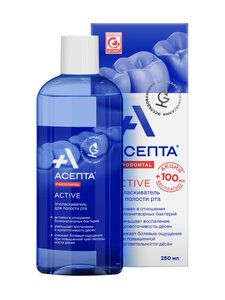 Средство комбинированного действия, предназначенное для применения при инфекционно-воспалительных заболеваниях полости рта, кровоточивости и воспалениях дёсен. Единственный ополаскиватель с комбинацией хлоргексидин и бензидамин для лечения воспалительных заболеваний пародонта. Оказывает комбинированное действие: противомикробное, противовоспалительное и обезболивающее. Мгновенный анестезирующий эффект позволяет быстро уменьшить болевые ощущения. Не содержит спирта, красителей и фтора, что позволяет рекомендовать его всем покупателям без ограничений.Активные компонентыБензидаминоказывает противовоспалительное и местное обезболивающие действие, что может сопровождаться чувством легкого онемения. Хорошо абсорбируется через слизистые оболочки и проникает в воспаленные ткани. Снижает болевую чувствительность в очаге воспаления.Хлоргексидинантисептик широкого спектра действия. Активен в отношении вегетативных форм грамотрицательных и грамположительных микроорганизмов, дрожжей, дерматофитов и липофильных вирусов.Мята и ментолоказывают противовоспалительное действие и надолго освежают полость рта.Клинические исследованияМногократно проведенные клинические исследования доказали, что двухкомпонентный ополаскиватель для полости рта АСЕПТА АКТИВ более эффективно борется причинами воспаления и кровоточивости по сравнению с однокомпонентными ополаскивателями – на 41% эффективнее снижает воспаление и на 43% снижает кровоточивость дёсен.