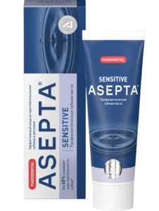Асепта Parodontal Сенситив — профилактическая зубная паста, предназначенная для бережного ухода за зубами и деснами. Она эффективно борется с чувствительностью зубов, предотвращает образование налета и кариеса, укрепляет зубную эмаль и улучшает состояние десен. Формула пасты содержит комбинацию растительных экстрактов, ферментов и минералов, которые обеспечивают комплексную защиту одновременно зубов и дёсен. Это делает ее идеальным выбором для людей с чувствительными зубами и деснами. Упаковка содержит 75 мл пасты. Низкая степень абразивности (RDA 60) позволяет проводить гигиену полости рта, не раздражая чувствительные дёсны. Комбинация 3-х десенситивных компонентов (цитрат калия, гидроксиапатит, термальная грязь) уменьшает чувствительность зубов и дёсен. Отсутствие агрессивных абразивов, антисептиков, лаурилсульфата натрия -не нарушает микрофлору полости рта и может использоваться на регулярной основе. Эффективность зубной пасты подтверждена клиническими исследованиями.Клинические исследованияМногократно проведенные клинические исследования доказали, что регулярное использование профилактической зубной пасты Асепта Сенситив в течение месяца позволяет снизить кровоточивость десен на 62%, снизить чувствительность зубов и дёсен на 48% и уменьшить воспаление на 66%.За 4 недели применения только зубной пасты у пациентов с хроническим пародонтитом улучшилось состояние полости рта по всем трем показателям:Активные компоненты Гидроксиапатитвосстанавливает повреждения и укрепляет кристаллическую решетку зубной эмали, повышая ее устойчивость к действию вредных кислот. Калия цитратснижает повышенную чувствительность дёсен и зубов, предупреждает возникновение кариеса. Растительные экстракты календулы, донника и аираоказывают противомикробное и противовоспалительное действие. Термальная грязьустраняет болевые ощущения, улучшает кровообращение в дёснах, ускоряет процесс заживления. Растительный фермент папаинрасщепляет минеральный матрикс назубных отложений и препятствует их повторному образованию, сохраняя белизну зубов. Не содержит лаурилсульфат натрия, антисептики и фтор