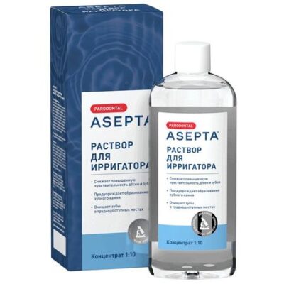 АСЕПТА РАСТВОР — концентрат для использования в ирригаторе для эффективного очищения зубов в труднодоступных местах и поддержания здоровья дёсен.+ Защищает дёсны от воспаления;+ Предупреждает образование зубного камня;+ Препятствует развитию кариеса;+ Освежает дыхание.